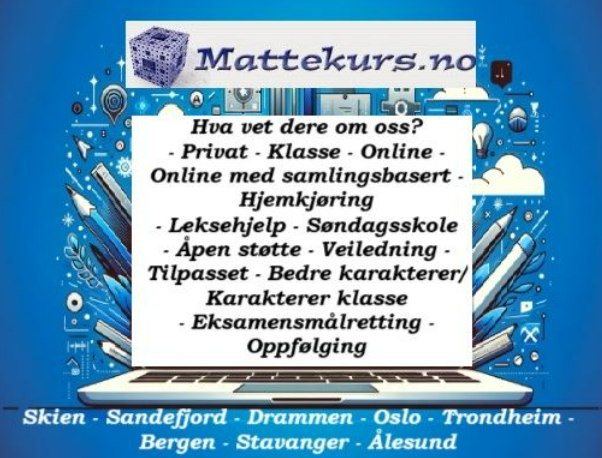 Med inn til to timer gratis støtteopplæring/veiledning kan veileder hjelper deg med å avklare om du har matte og realfag vansker eller hvordan det skal løses og veiledning om dette. send sms 911 74 832 eller bestil time hos oss veilederen e-post: koronakonsult@yahoo.com